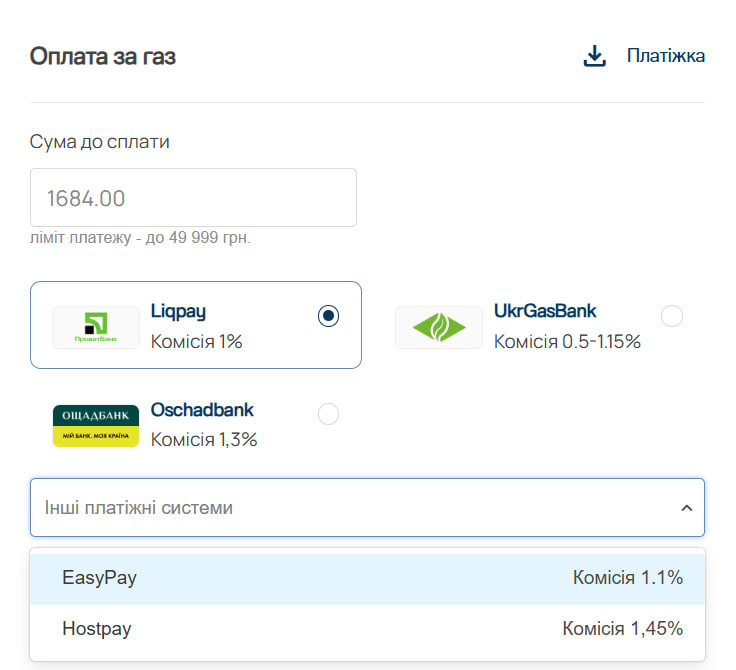 Зато в личном кабинете Газоснабжающей компании "Нафтогаз" (другая "дочка" "Нафтогаза", которая взимает с потребителей оплату за сам газ, а не за его распределение - ред.) оплату можно осуществить с помощью сразу 5 платежных электронных систем. Кроме EasyPay это также Hostpay и государственные "Ощадбанк", "Приватбанк" и "Укргазбанк".