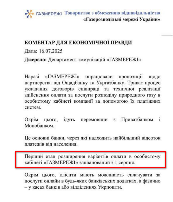 Вместо того, чтобы добавить на сайт дополнительные опции для оплаты счета за распределение газа, в "Газмережах" советуют украинцам "платить за услуги онлайн через банковские приложения, или физически - в кассах банков или отделениях "Укрпочты".