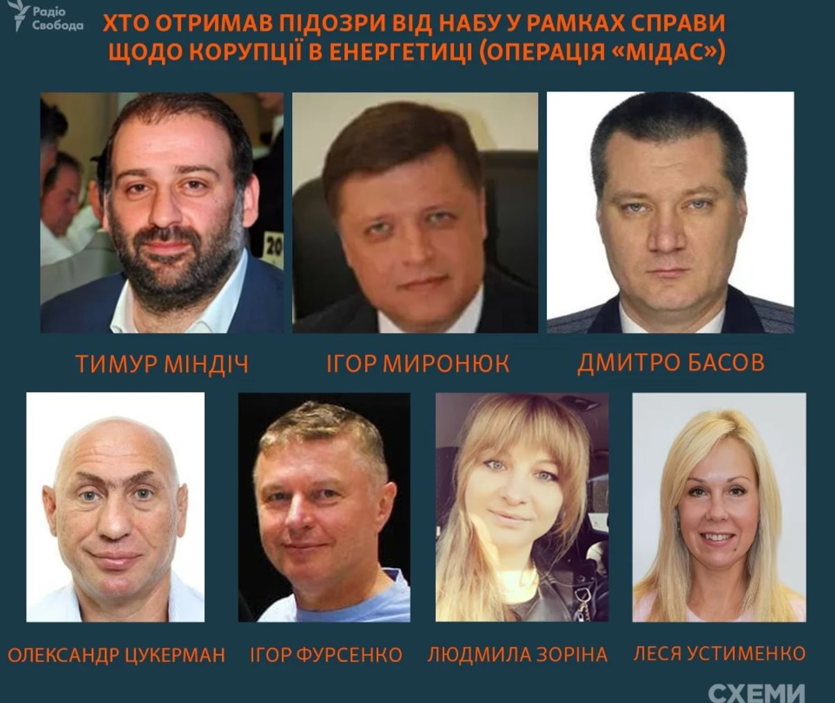По информации проекта "Схемы", кроме Тимура Миндича ("Карлсон"), экс-советника министра энергетики Игоря Миронюка ("Рокет"), исполнительного директора по безопасности "Энергоатома" Дмитрия Басова ("Тенор"), Александра Цукермана ("Шугармен"), подозрения получили Игорь Фурсенко ("Решик"), Леся Устименко и Людмила Зорина.
