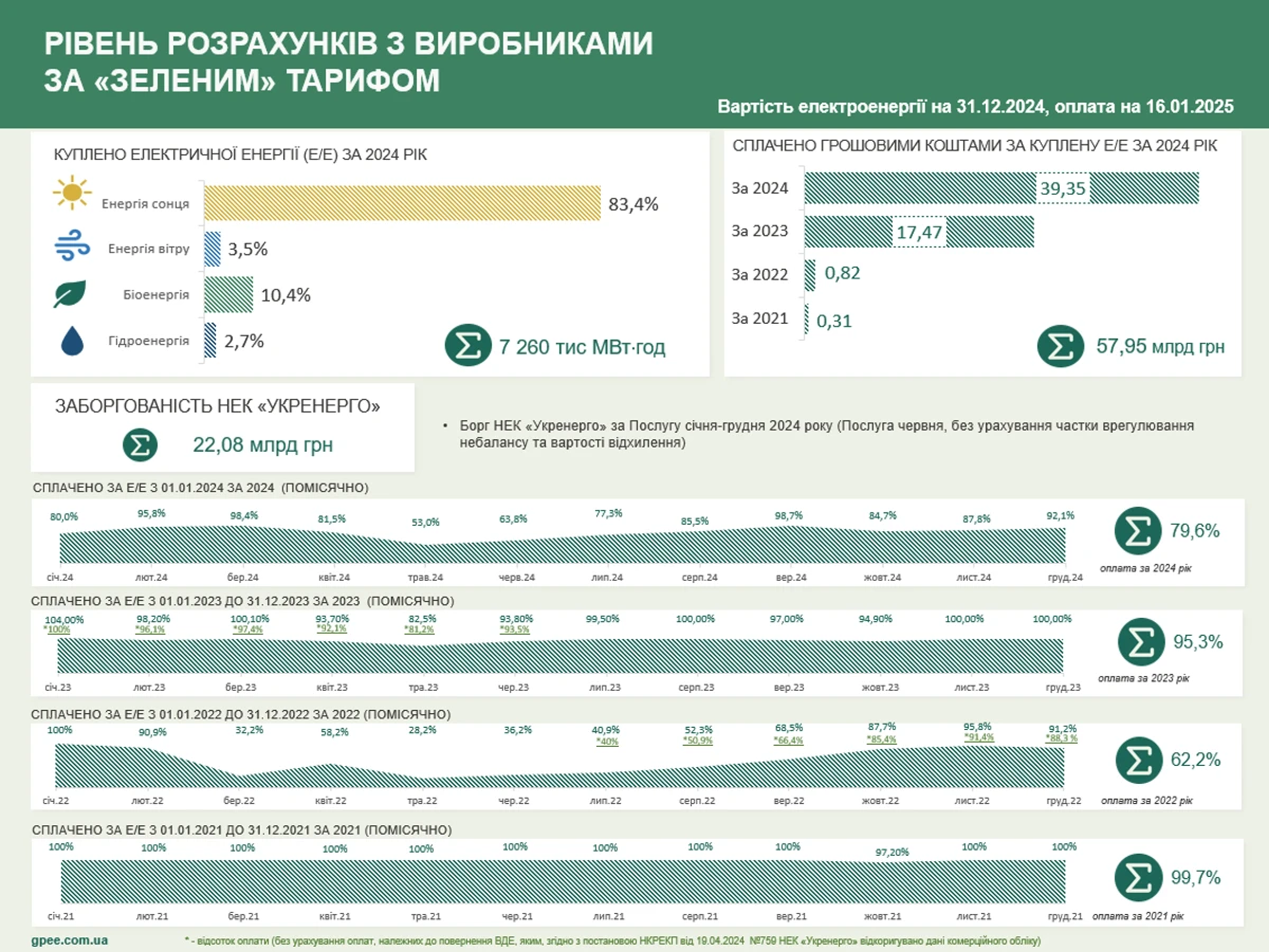 В Украине уровень оплаты за электроэнергию по "зеленому" тарифу в 2024 году составил 79,6%.