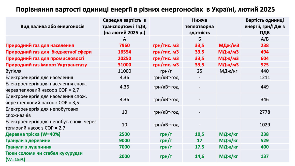 Видно, что стоимость единицы энергии в природном газе для населения составляет 238 грн за ГДж, как и для древесной щепы. Однако этого недостаточно для замещения газа древесной щепой, поскольку стоимость котла для сжигания биомассы в среднем в три раза выше, чем стоимость котла для сжигания природного газа.