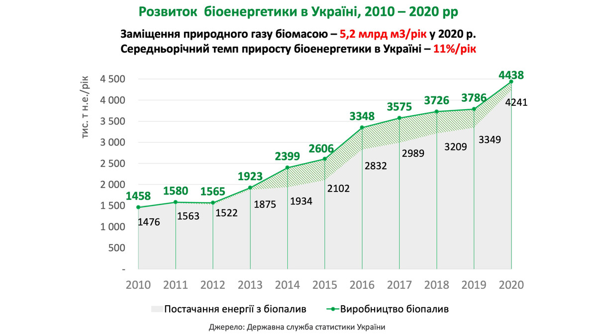 Замещение происходило прежде всего при производстве тепловой энергии путем установки котлов и ТЭЦ на твердых видах биотоплива (дрова, древесная щепа, пеллеты из древесины и шелухи подсолнечника, солома) в частных хозяйствах, централизованном теплоснабжении, промышленности. Также в Украине работают 140 МВт электрической мощности на биогазе и 178 МВт - на твердых видах биотоплива. Средний темп роста сектора в 2010-2020 годах составил 11% в год.