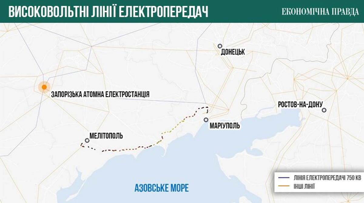 Первый - строительство ЛЭП длиной 201 км между подстанциями в оккупированных Мелитополе и Мариуполе. Эта линия является частью планов Российской Федерации по присоединению энергосистемы временно оккупированных территорий к своей сети.