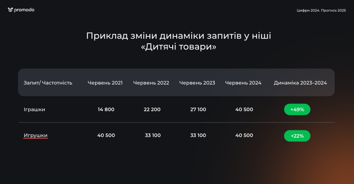 Ощутимую положительную динамику видим и в нише "Детские товары", где запросы на украинском уже пересекли отметку в 50%. Вместо русскоязычного "игрушки" украинцы стали чаще гуглить слово "игрушки". За год рост составил 49%.