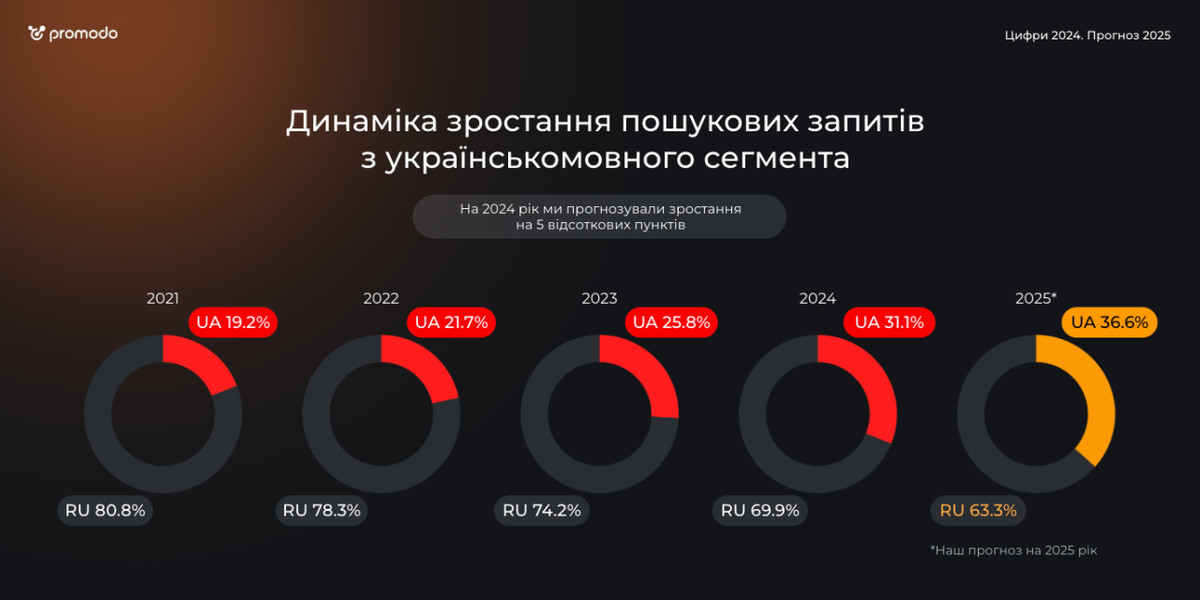 В любом случае не забывайте, что несколько лет назад мы были частью "рунета", и запросы на украинском считались исключением и колебались на уровне нескольких процентов. Мало кто из бизнесов вкладывался в продвижение украиноязычных страниц да и вообще не все имели их на своих площадках.