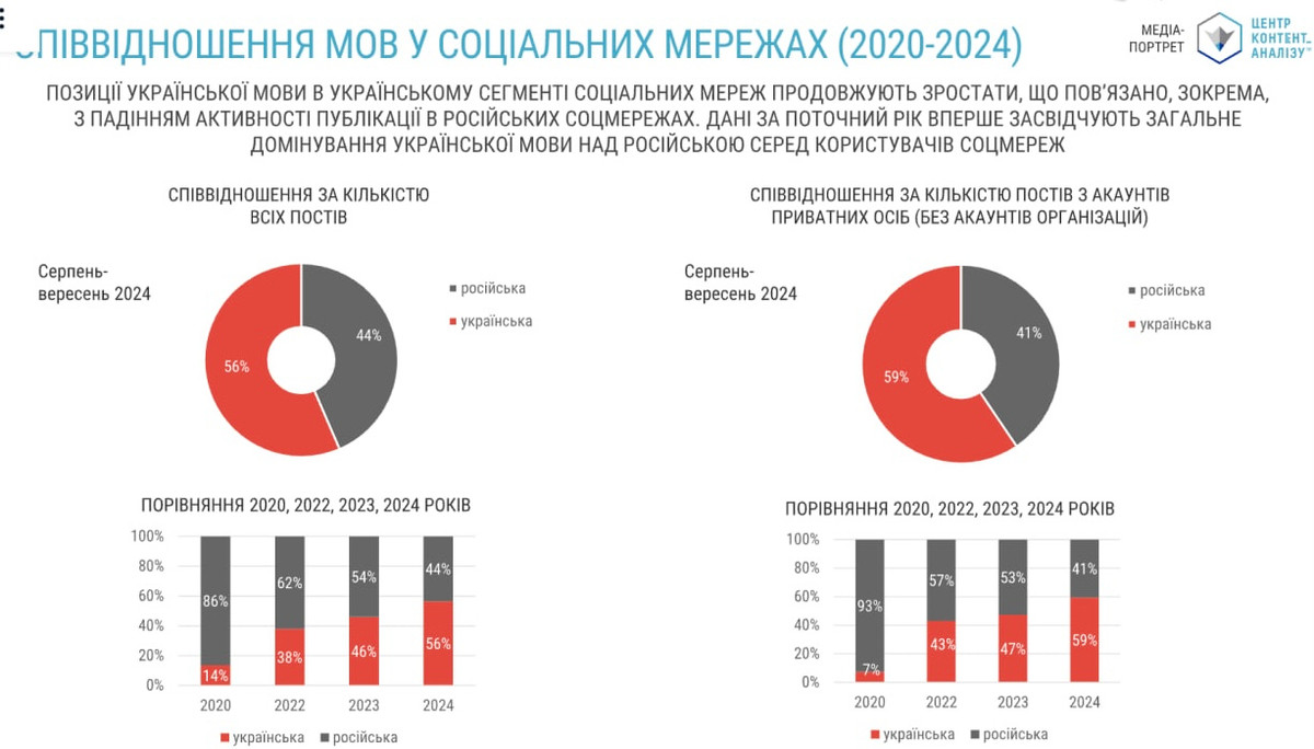 Динамику роста популярности языка в онлайне фиксируют и многие другие исследования. Например, в Центре контент-анализа говорят, что 87% постов в Instagram уже на украинском, в Facebook - 79%. А вот в TikTok в этом году наблюдался регресс. С 55% в 2023 году - до 47% в 2024. Интересно, что в быту многие замечают рост употребления русского в течение года, в онлайне - картина другая.