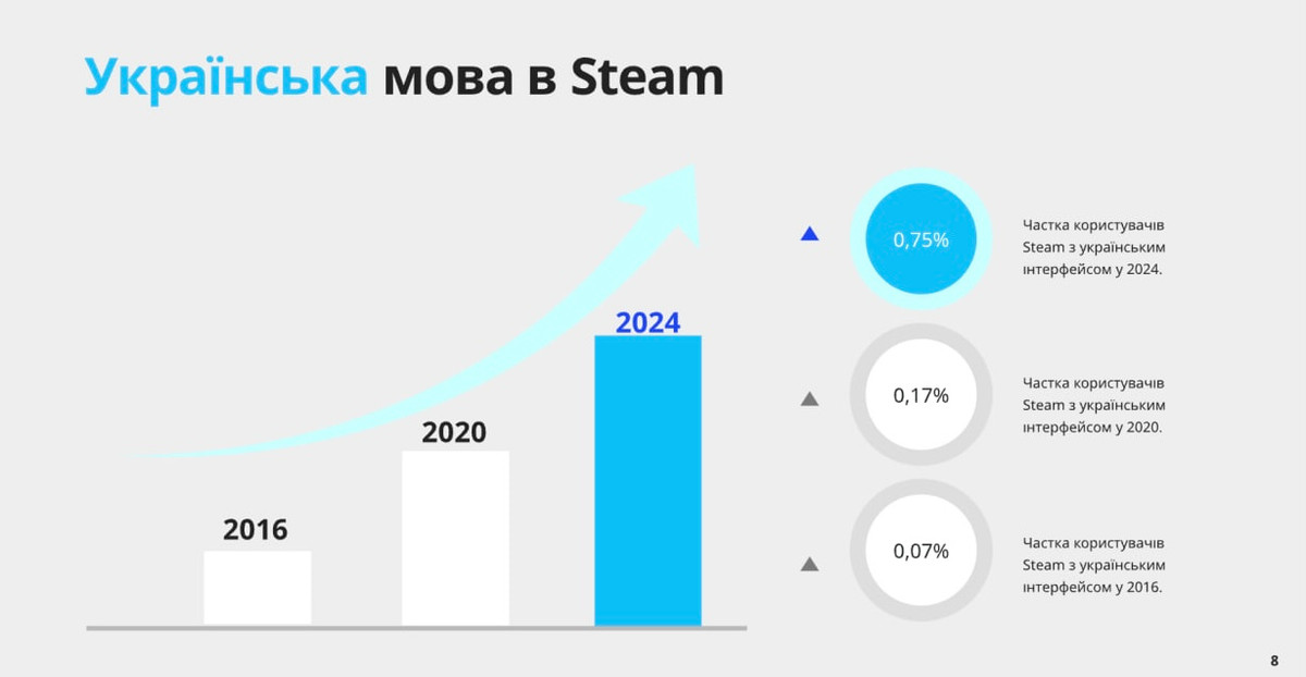 В Bolt рассказали, что в Киеве и пользователи, и водители почти поровну выбирают украинский и русский как язык приложения, украинский немного преобладает. В Steam (это онлайн-сервис распространения видеоигр) выросла доля пользователей, которые поставили себе интерфейс на украинском - с 0.17% в 2020 году до 0.75% в 2024. Кстати, команда сервиса поделилась, что зарубежные медиа и блогеры советуют играть в S.T.A.L.K.E.R. 2 именно с украинской озвучкой.