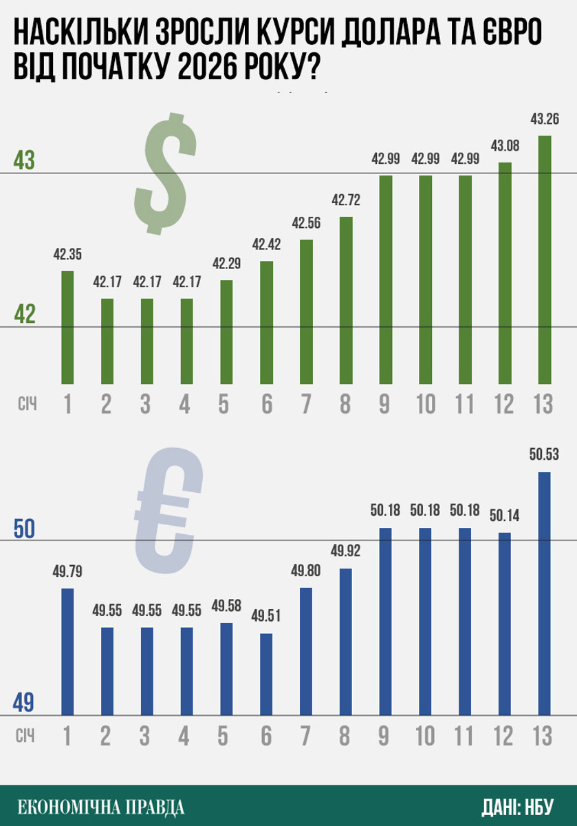 С начала 2026 года гривна ежедневно бьет новые антирекорды. 13 января официальный курс доллара, установленный Нацбанком, впервые в истории достиг 43,25 грн, а евро – 50,52 грн.