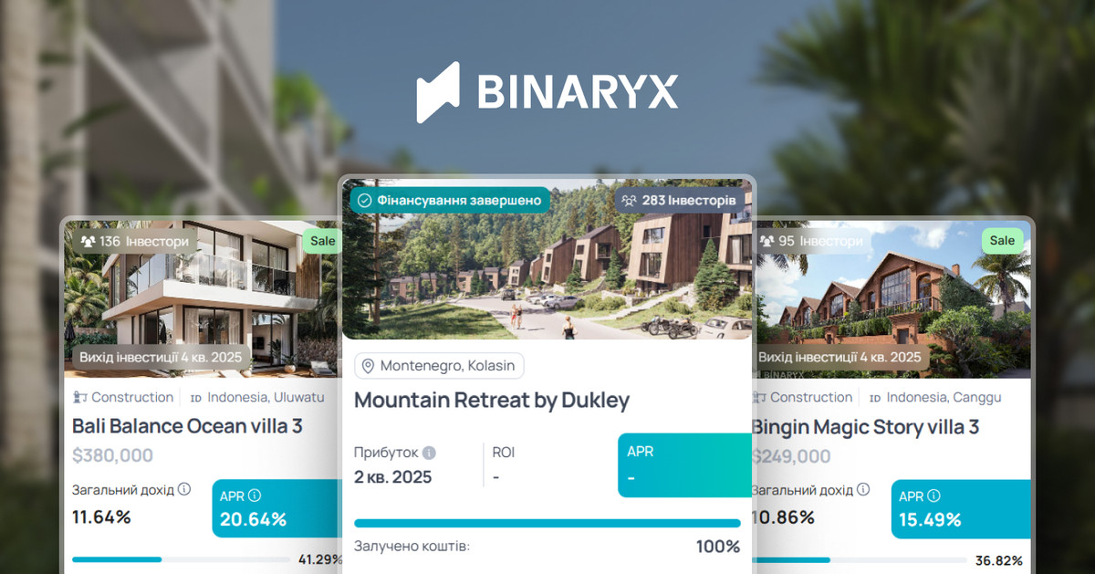 На данный момент, на платформе Binaryx уже проинвестировано более 136 млн грн, а инвесторы получили более 9 660 000 грн в валюте или в виде выплат от аренды. Эти результаты доказывают: модель токенизированной недвижимости работает, а спрос на нее растет. И это только начало. На платформе сейчас представлены 23 объекта: 15 - на стадии застройки, 8 - уже сдаются в аренду через Booking и Airbnb.