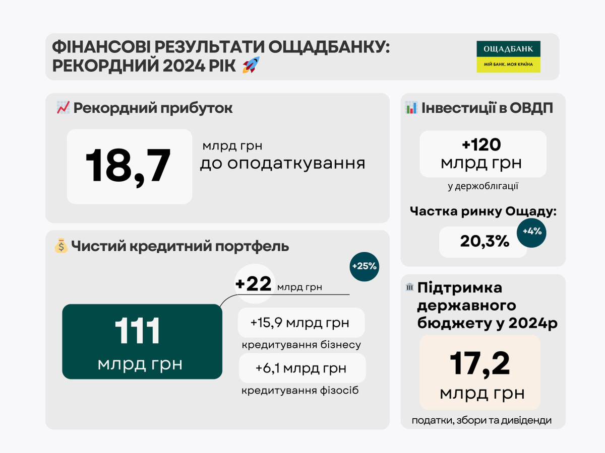 Объем чистого кредитного портфеля Ощадбанка за 2024 год увеличился на 22 млрд грн (+25%) и превысил отметку 111 млрд грн. Это стало возможным за счет активного кредитования как бизнеса (+15,9 млрд грн с начала года), так и физлиц (+6,1 млрд грн).