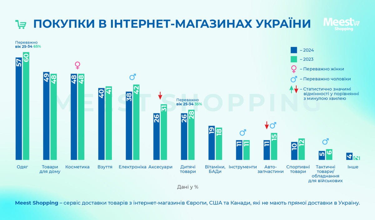Среди самых популярных категорий товаров остаются одежда, товары для дома, косметика, обувь и электроника. Однако по сравнению с 2023 годом украинцы реже заказывали и дорогие продукты питания, зато чаще покупали технику, электронику и косметику.