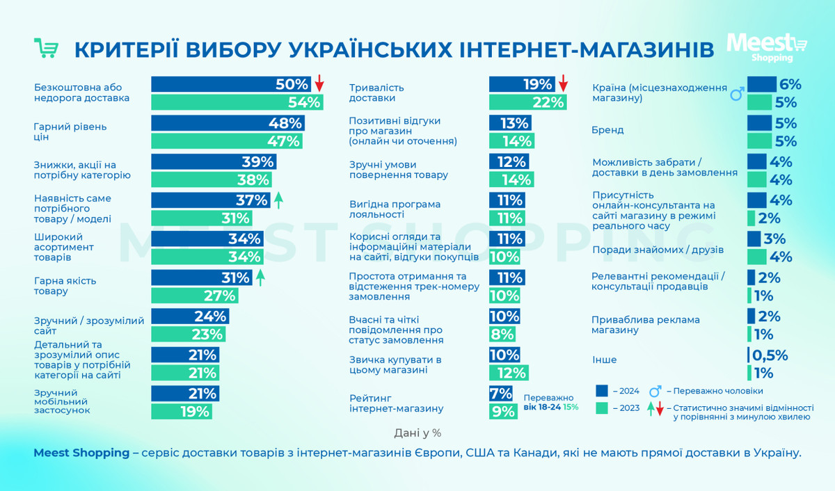 Изменились и критерии выбора интернет-магазинов. В 2024 году покупатели чаще обращали внимание на наличие товара и его качество. Зато цена и срок доставки несколько потеряли свою значимость, хотя все равно остаются важными факторами выбора.