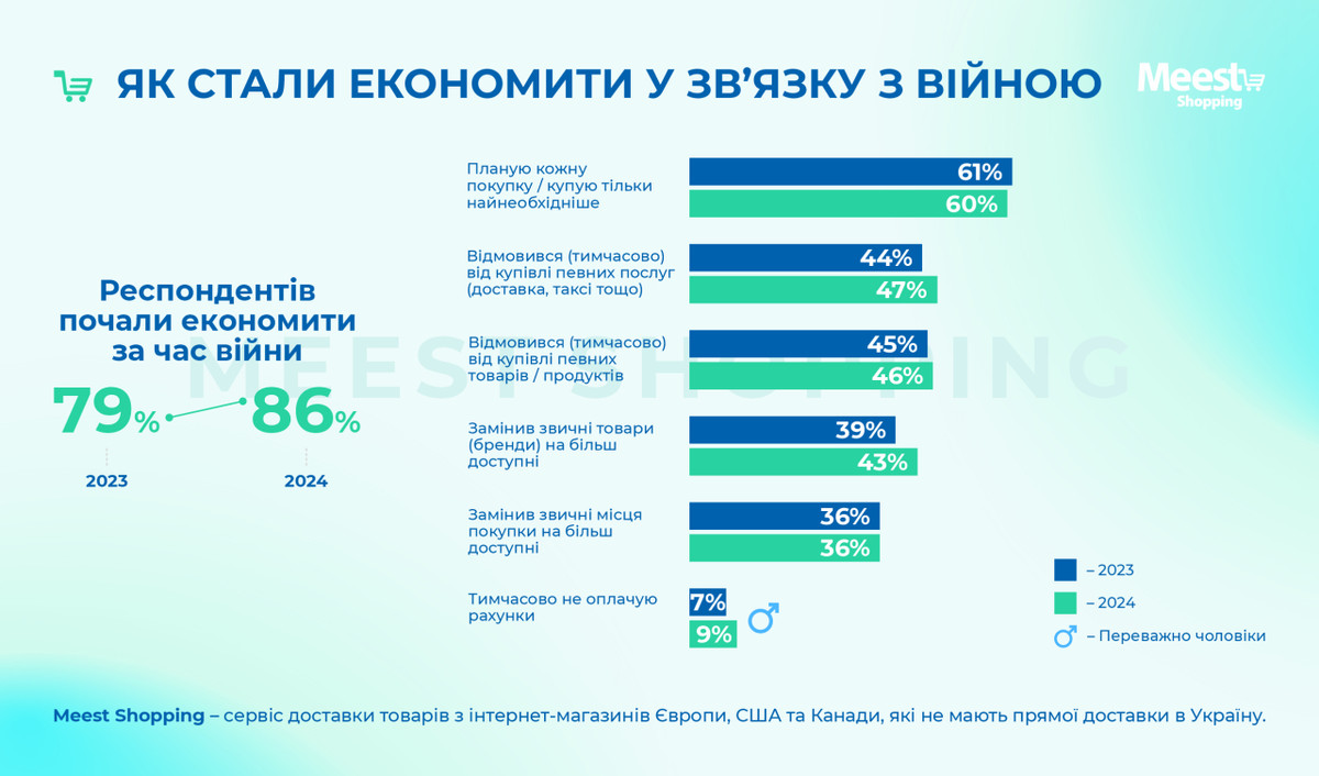 В целом участники исследования сообщают о снижении собственных финансовых возможностей. У большинства семей хватает денег на еду и иногда на одежду, однако для приобретения бытовой техники, особенно крупной, приходится экономить или занимать. Более 85% украинцев начали экономить во время войны: многие планируют покупки заранее, временно отказываются от определенных товаров или услуг.