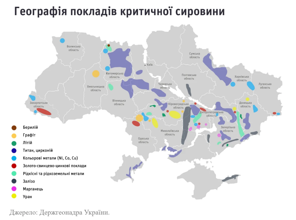 Анализ перечней полезных ископаемых, отнесенных к стратегическому и критическому сырью, свидетельствует, что в Украине сосредоточено 23 из 50 стратегических минералов, определенных США как критически необходимые, и 26 из 34, признанных ЕС критически важными, а также 8 из 18, отнесенных к таковым правительством Великобритании.