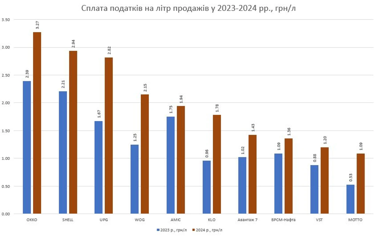 "Налог на прибыль - рост в 1,5 раза, до 2,2 млрд грн. Опять-таки, рост от 13% у ОККО до 2 раз у WOG и UPG и в 7,5 раза - у Мотто. KLO и Avantage 7 показали уменьшение прибыли", - отмечает глава "А-95".