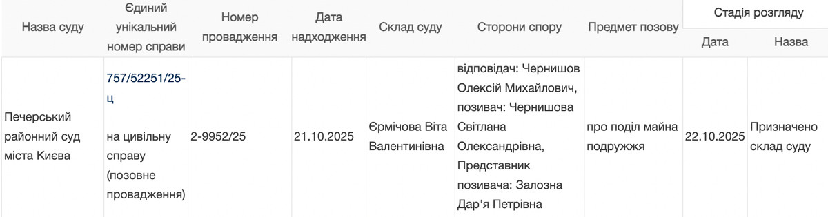 Отмечается, что иск она подала в Печерский районный суд города Киева. Ответчик – Алексей Чернышов.По делу назначен состав суда.