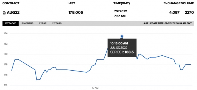 Так, на торгах в четверг ближайший августовский контракт достиг отметки в 1972,96 доллара за тысячу кубов (183,5 евро за МВт-час). После котировки уменьшились до 1913,82 доллара за тысячу кубометров на 11:50 по Киеву.