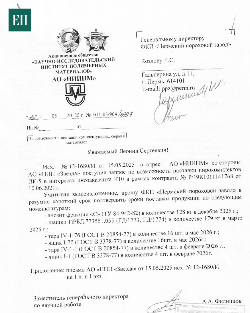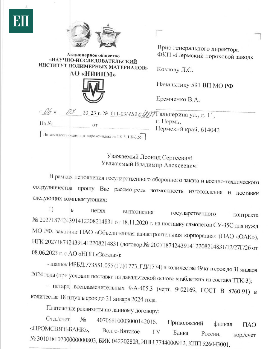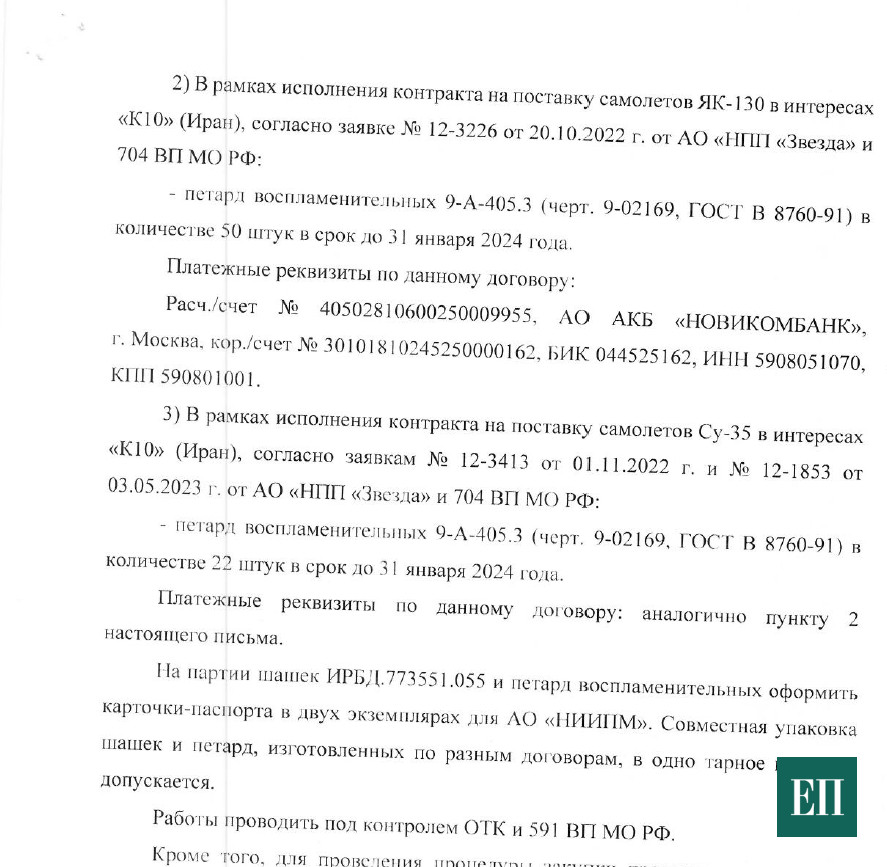В одном из документов отмечается, что по плану поставки продукции для производства "пирокоплектов ПК-5" (используются в креслах катапульты Як-130 и Су-35) на выполнение контракта с Ираном должны происходить в течение марта-мая 2026 года.