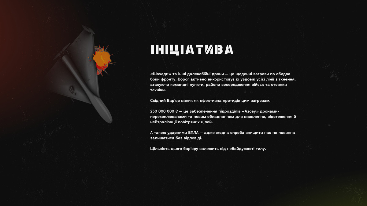 Восточное направление остается одним из самых сложных. Противник регулярно работает с воздуха, используя дальнобойные беспилотники не как разовую тактику, а как системное давление — по пунктам управления, скоплениям личного состава, технике и логистике. В этой реальности АЗОВ.ONE запускает оборонный сбор "Восточный барьер" с целью 250 миллионов гривен.