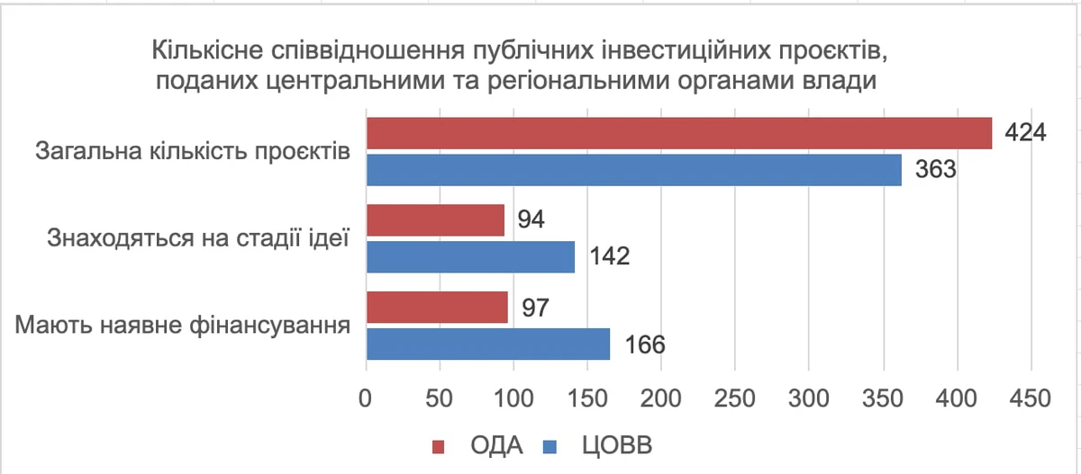 Показательно, что из 424 проектов, поданных обладминистрациями, только 97 (23%) имеют имеющееся финансирование, тогда как для поданных центральной властью, этот показатель вдвое выше. При этом общий бюджет проектов региональных администраций в 8,3 раза меньше, чем у проектов, инициированных министерствами и ведомствами.