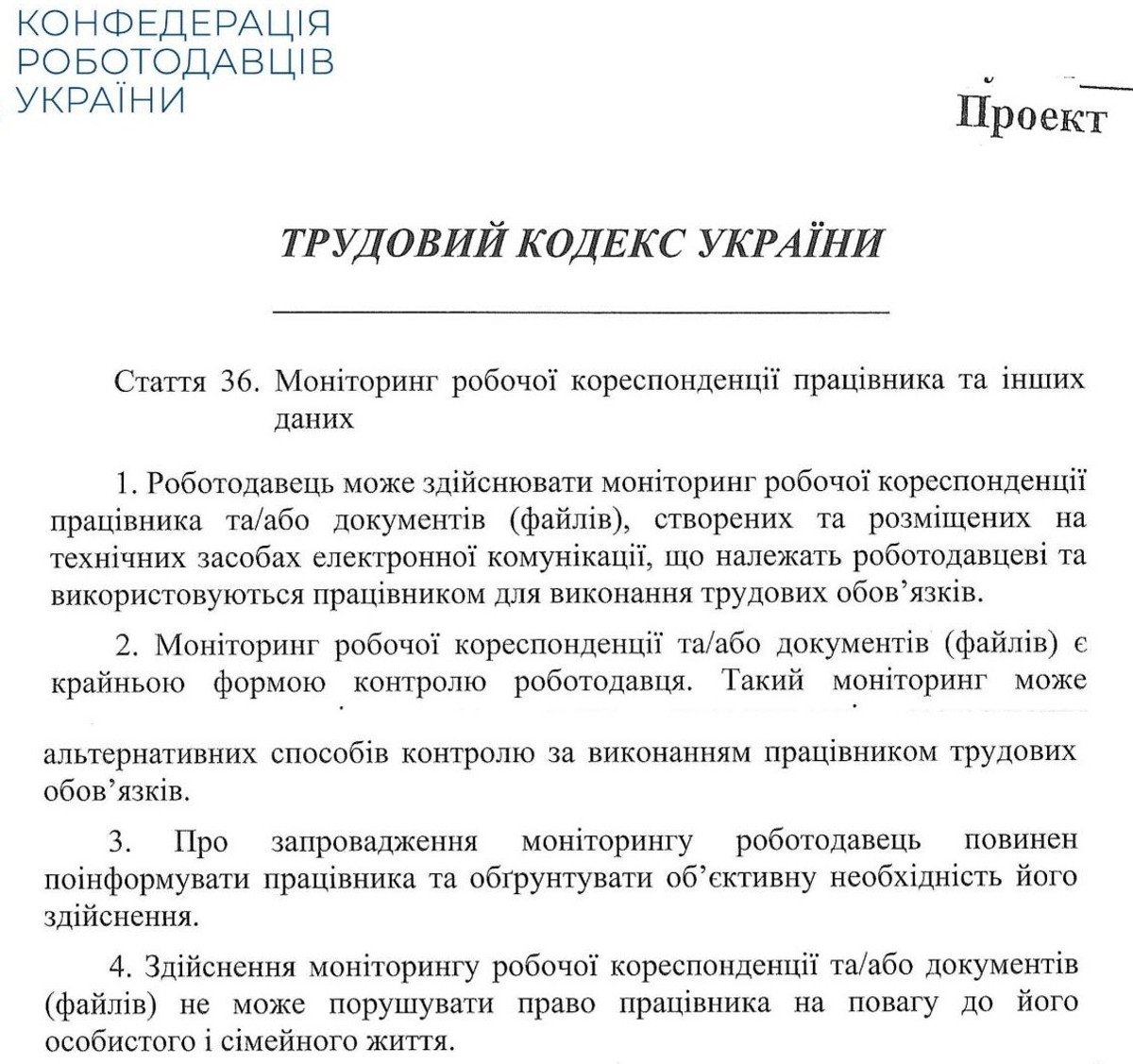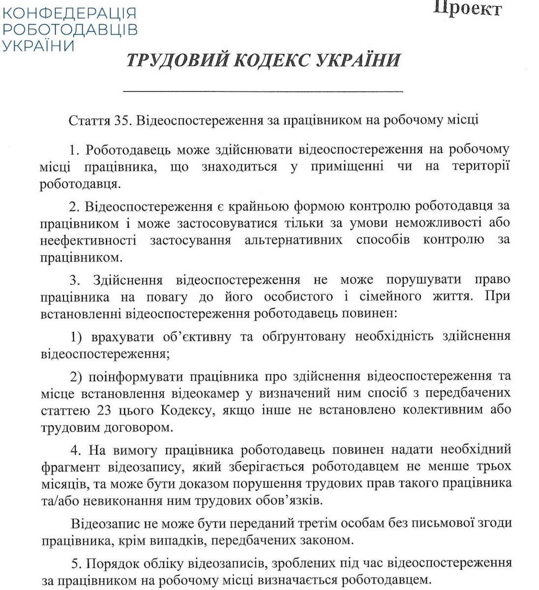 Он должен заменить нынешний Кодекс законов о труде, который с 1971 года "осовременивали" почти 200 раз. В перечне наиболее чувствительных для работников положений нового Трудового кодекса – разрешение на видеонаблюдение во время работы и мониторинг рабочей корреспонденции, что предусматривают статьи 35 и 36 проекта.