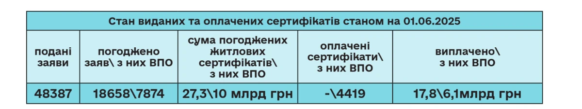 Исследование показало, что компенсация за уничтоженное жилье (жилищные сертификаты/"еВідновлення") дала лучший результат, по состоянию на июнь 2025 года. Так, внутренне перемещенные лица получили 4 419 жилищных сертификатов (на 6,1 млрд грн выплат из общих 10 млрд грн согласованных для ВПЛ).