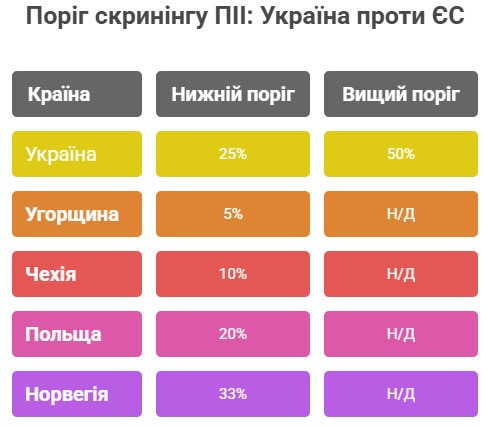 Вопреки возможным ожиданиям предложенные пороговые показатели – 25% и 50% (ст. 9) – располагают Украину среди более либеральных режимов в Центральной и Восточной Европе. Большинство членов ЕС, которые ввели скрининг после 2020 года, выбрали более низкие пороги: Венгрия – 5%, Чехия, Болгария, Словакия и Дания – 10%, Польша – 20%. Только Норвегия использует более высокий порог – 33%.