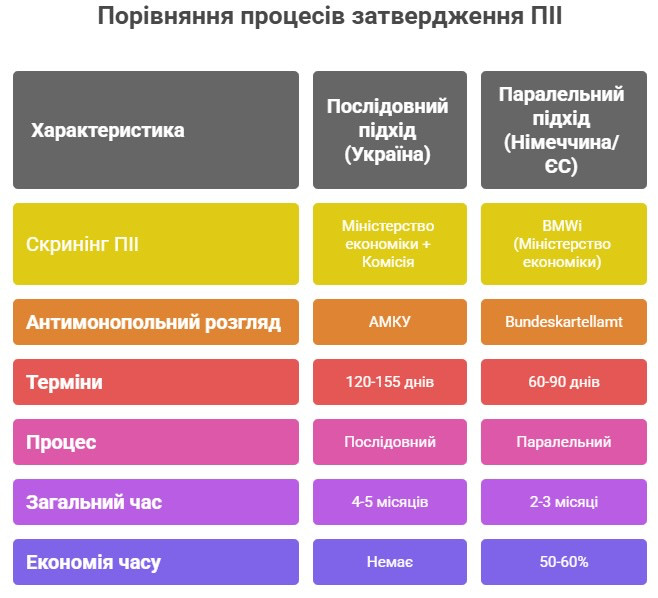 Последовательный подход отличается от практики большинства стран ЕС. В Германии, Франции, Польше, Испании, Италии, Австрии, Нидерландах, Чехии, Румынии инвестор может одновременно подавать документы в орган скрининга и национальное конкурентное ведомство. Процессы идут параллельно, что сокращает общее время ожидания.