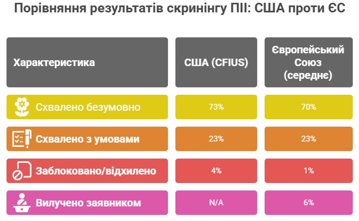 Эффективные механизмы демонстрируют схожие показатели независимо от институционального дизайна: CFIUS одобряет большинство сделок, блокируя лишь 4%; в масштабах ЕС 70% сделок одобряются безусловно, 23% – с условиями, блокируется лишь 1%.