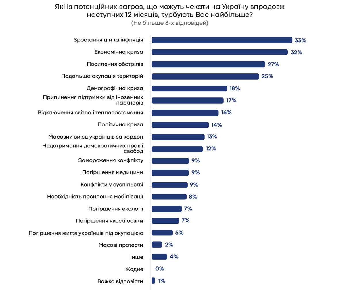 Основными угрозами для украинцев, согласно опросу, является рост цен. Об этом сообщило 33% респондентов, экономический кризис беспокоит 32% респондентов.