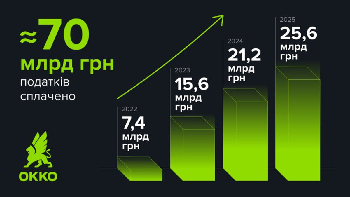 Группа компаний ОККО по итогам деятельности в 2025 году заплатила 25 млрд 594 млн грн налогов и сборов. Это на 4,4 миллиарда гривен, или на 21% больше, чем было перечислено за 2024 год. Об этом сообщается на сайте ОККО.