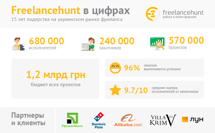 Среди клиентов фриланс-сервиса не только частные лица, мелкий и средний бизнес. Партнерами маркетплейса являются такие бренды, как Приватбанк, Villa Krim, Domino's Pizza, ЛУН, Alibaba и многие другие.