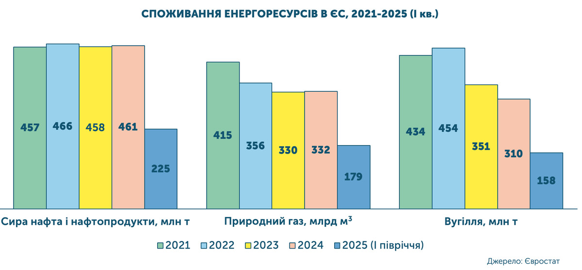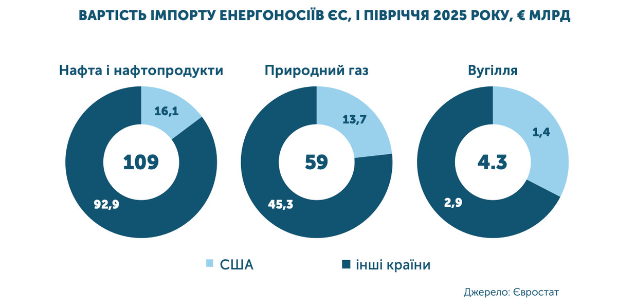В первом полугодии 2025-го, согласно данным Евростата, ЕС импортировал 210 млн тонн нефти и нефтепродуктов, 137 млрд кубометров газа и 29 млн тонн угля на общую сумму более 172 млрд евро. Из этих средств в США направили чуть более 31 млрд евро, за которые приобретено 31,8 млрд кубометров LNG, 29,2 млн тонн нефти и нефтепродуктов, 10,9 млн тонн угля. Доля американских энергоносителей в потребительской корзине европейских стран сейчас составляет 22%.