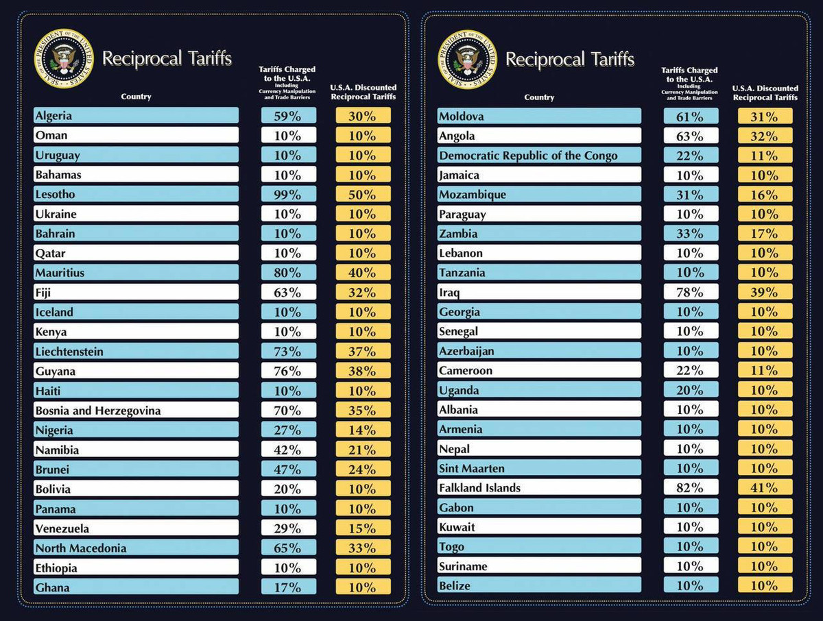Кроме этого, во время своего выступления Трамп показал таблицу индивидуальных пошлин, которые будут введены в отношении отдельных стран или объединений. Эти пошлины будут добавляться к базовым.