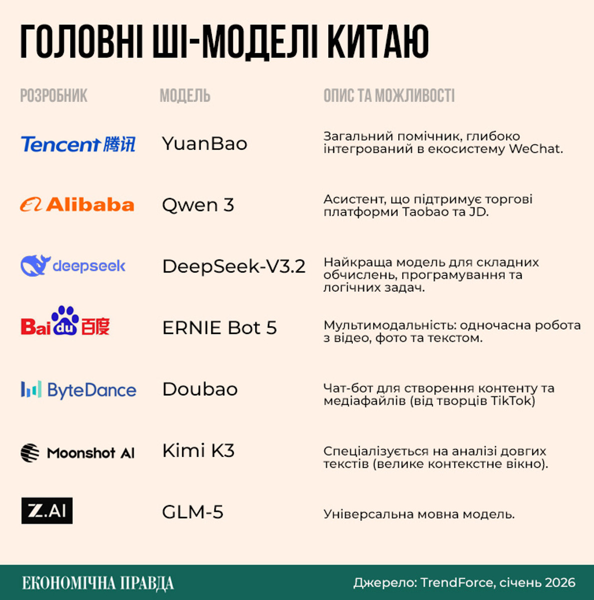 Doubao – ИИ-ассистент компании ByteDance, владелицы TikTok. Doubao является одним из самых популярных ИИ-приложений в Китае. К декабрю 2025 года сервис имел 172 млн пользователей в месяц и обрабатывал более 50 трлн токенов ежедневно. ByteDance контролирует 37,5% китайского рынка Model-as-a-a-Service (доступ к готовым ИИ-моделям через облачные сервисы), который за первое полугодие 2025 года вырос на 421%.