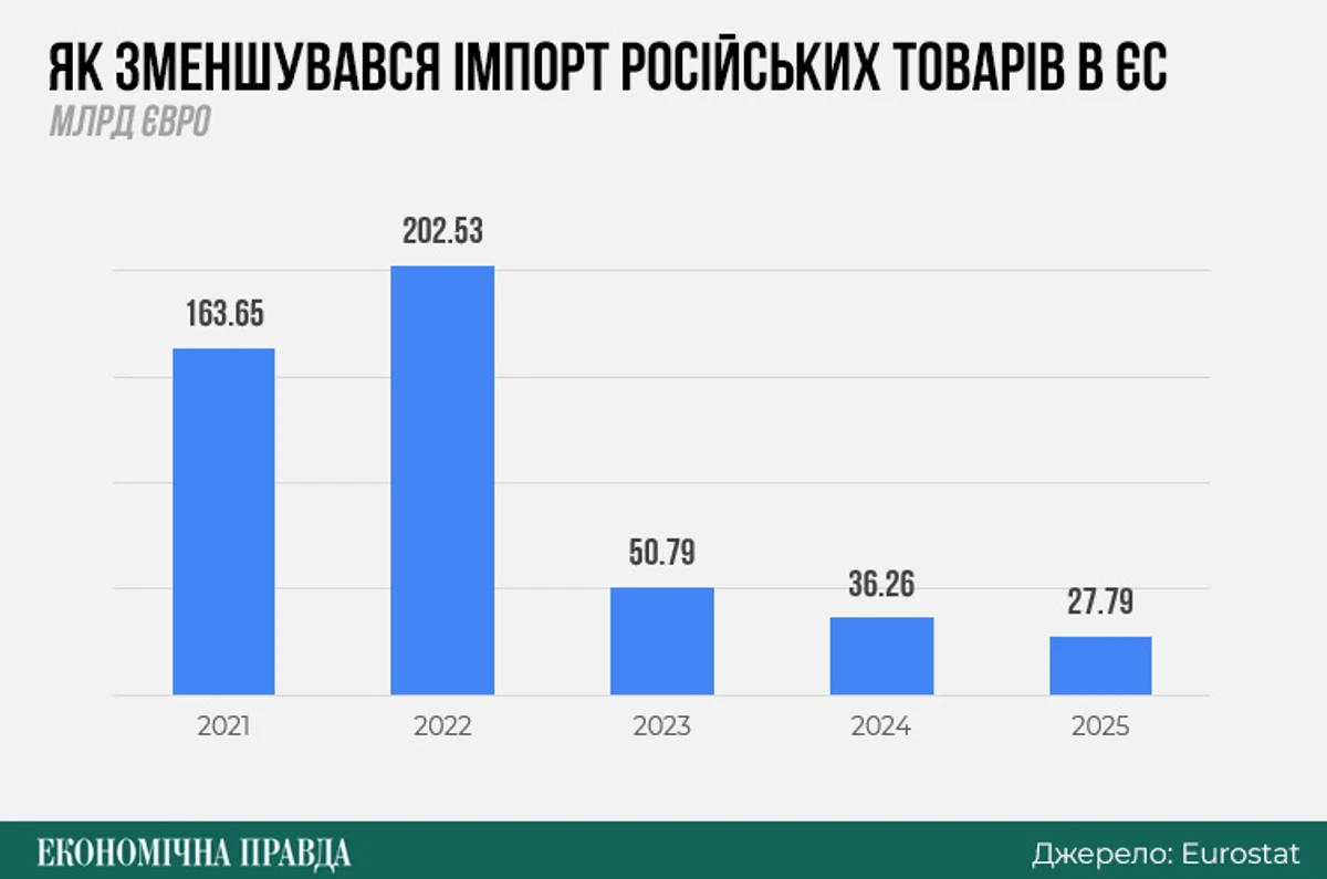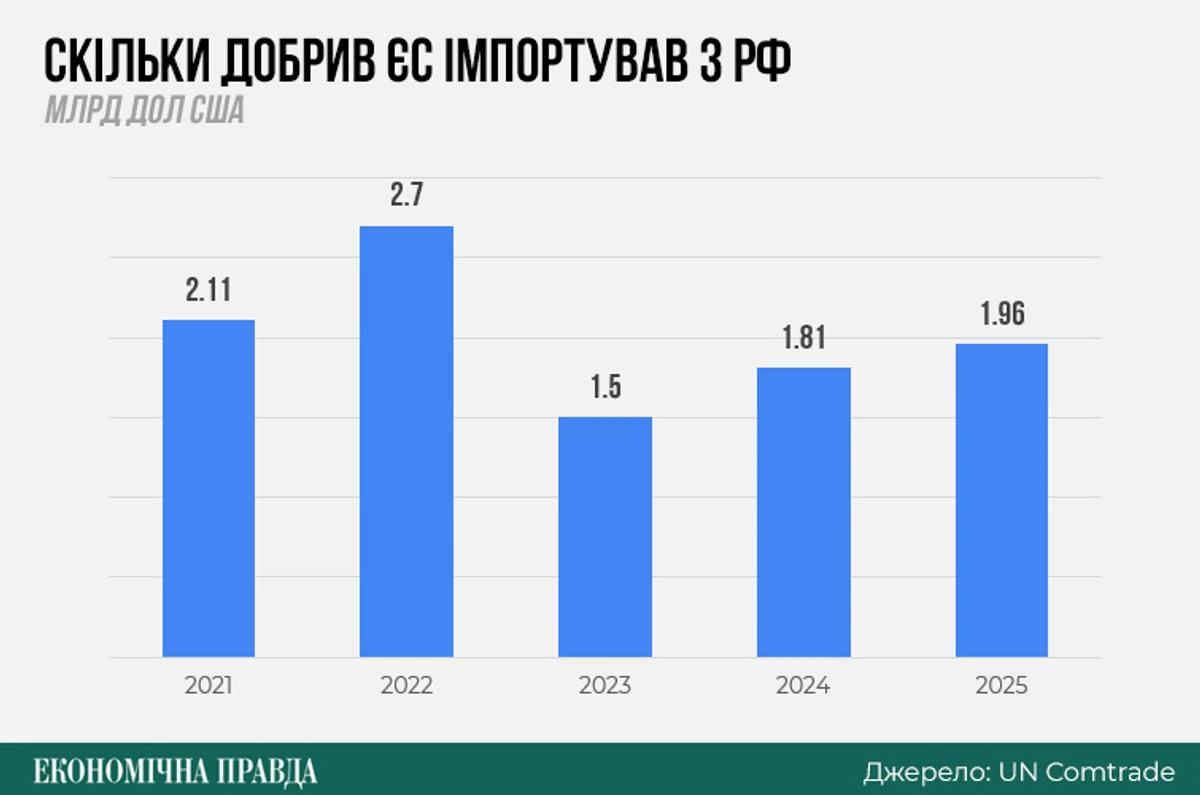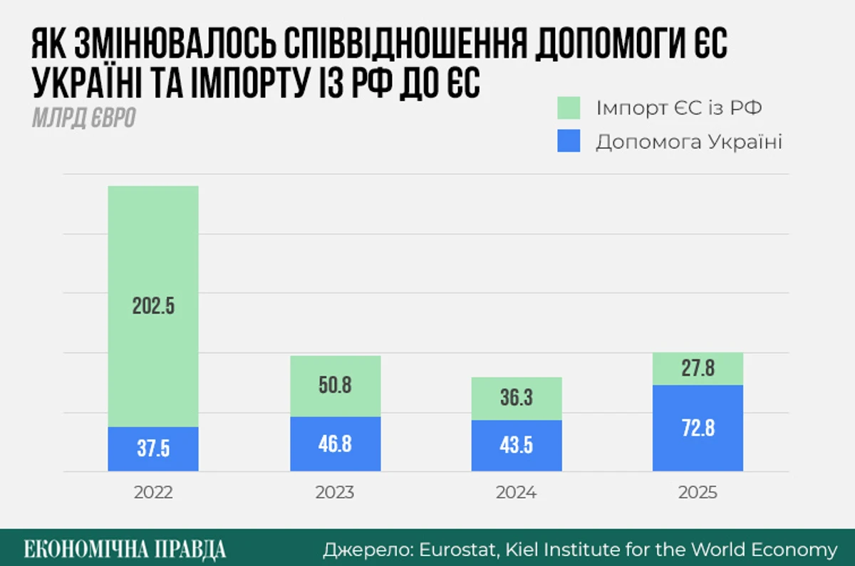 Із січня 2022 року по грудень 2025 року ЄС купив в РФ товарів на 317 млрд євро. Водночас фінансова допомога Україні за цей період, за оцінками Кільського інституту світової економіки, сягнула 201 млрд євро (включно із запланованою).
