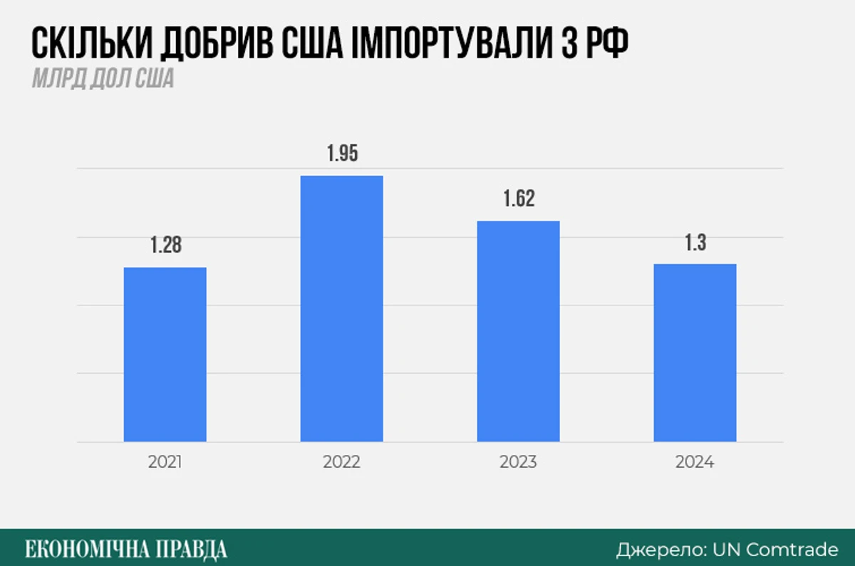 США теж не зупинили імпорт з РФ, хоча і суттєво його скоротили: з 14,14 млрд дол. у першому півріччі 2021 року до 2,5 млрд дол. за січень-червень 2025-го.