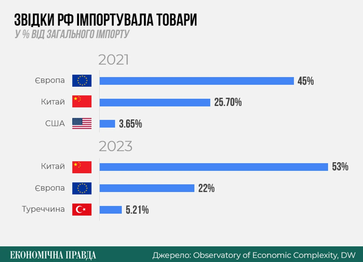 Ключові покупці відомі: Туреччина, Індія, Китай. Залежність РФ від торгівлі з КНР досягла таких масштабів, що Москву називають васалом Пекіна. Попри оборонну та фінансову підтримку України, ЄС теж купує товари з РФ і не лише сировину.