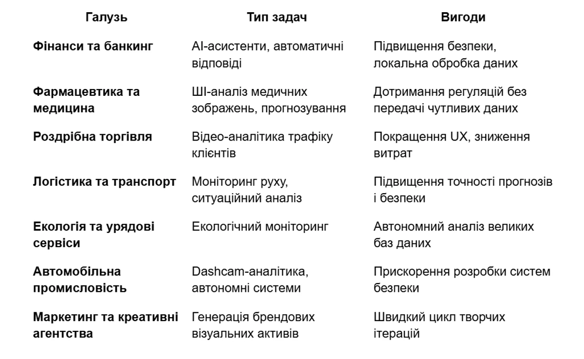 - Гнучкість застосування — від чат-ботів і відео-аналітики до тонкого налаштування моделей та генеративних робочих навантажень.