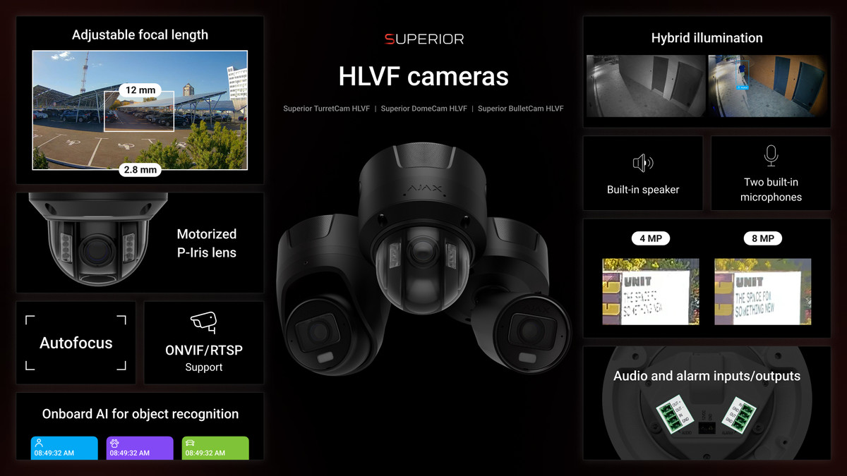 У серії Superior дебютували камери HLVF із гібридним підсвічуванням, удосконаленим CMOS і діафрагмою P-Iris для чіткого зображення за будь-якого освітлення. Також передбачено двосторонній аудіозв'язок і монтажну коробку з динаміком для активного відлякування.