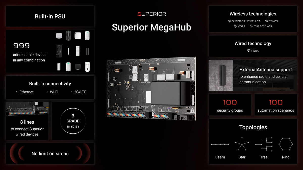 Ще одна новинка — Superior Hub Hybrid 2 для об'єктів із підвищеними вимогами: до 250 пристроїв (без обмежень на сирени), 25 груп, 64 сценарії та 100 користувачів; також Grade 3, що спрощує масштабування від середніх до великих проєктів.