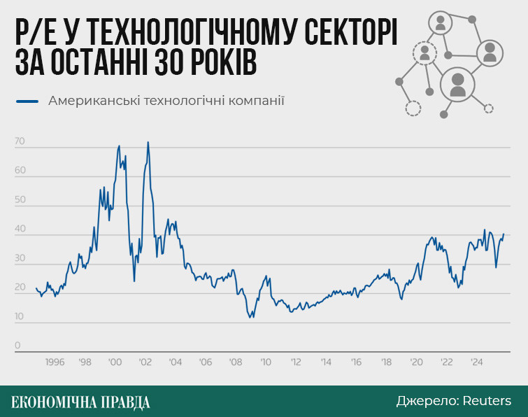 Хоч американський фондовий ринок і нагадує період перед вибухом доткомів, до його піку ще далеко. З 2011 року акції компаній із США зросли в сім разів, а технологічний сектор – у 16. Водночас зараз оцінки не такі завищені, як у 1999-2000 роках: середнє співвідношення капіталізації до прибутку (коефіцієнт P/E) семи найбільших компаній (Microsoft, Apple, Nvidia, Amazon, Meta, Alphabet, Tesla) – 70 проти понад 270 на піку доткомів.